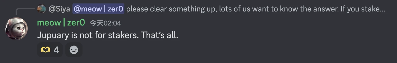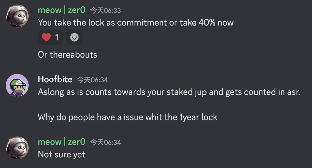 考虑到 Jupiter 提案的投票主体即为 JUP 质押用户,meow 的这一表态必然会遭致 JUP 持有者们的反对压力, 但 meow 对此的逻辑则是空投主要面向使用了 Jupiter 产品的狭义用户,质押行为与空投无关(该部分行为会通过 ASR 模块获得奖励),但质押者也可以通过使用 Jupiter 的行为来获取空投”。