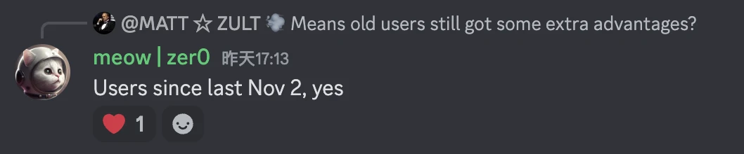 对此有用户进一步询问是否所有老用户都有资格获取第二轮空投,meow 给出的明确回复则是“自去年 11 月以来的用户” —— 注意这里的“用户”一词,下文会细说。