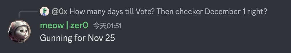 关于空投时间,有用户曾询问“投票还有几天开放?空投查询是否将于 12 月 1 日上线?”,meow 给出了“预计 11 月 25 日开放”的答案,但并未明确指出对应哪个问题。