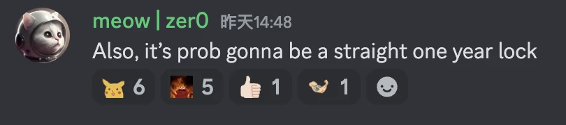 meow 本人曾提到“预计空投将会有 1 年的锁仓限制”。