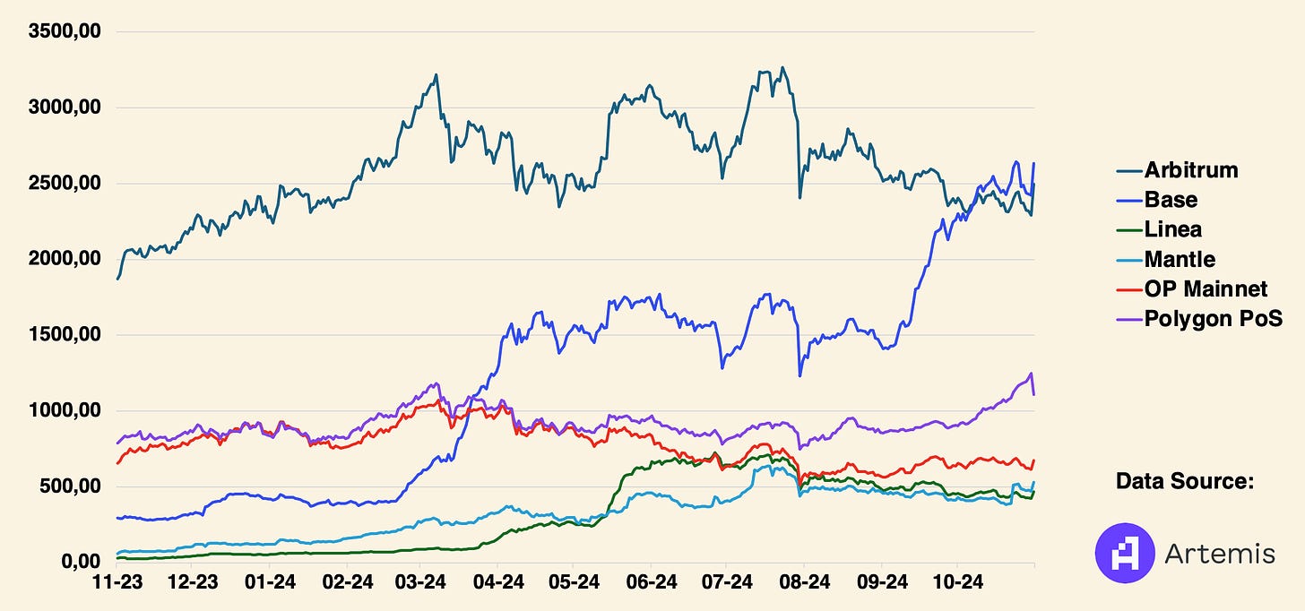 正如我们在图表中看到的,截至 11 月 7 日,Base 是领先的 Layer 2 区块链。几周前,它在总锁定价值 (TVL) 上超过了 Arbitrum,并在每日活跃地址和每日交易类别中连续数月保持其作为第一 Layer 2 的地位。