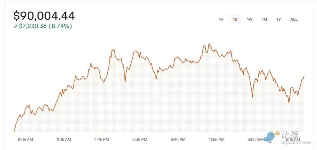 根据 TradingView 数据, 11 月 12 日太平洋标准时间 12: 56 ,比特币在 Coinbase 上涨突破 90, 000 美元,过去一天涨幅 11% ,距离进入 10 字头仅一步之遥。