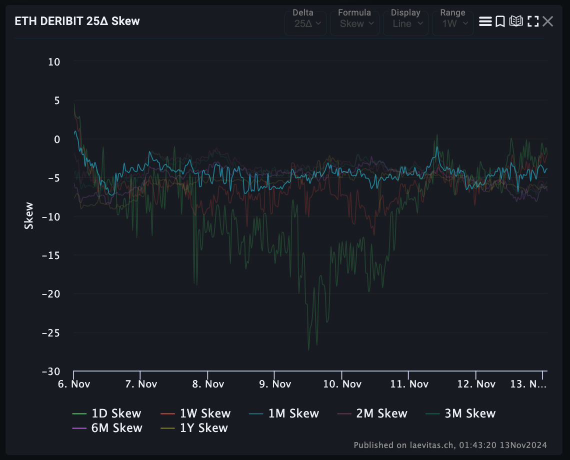 此外,从以太坊选择权市场的角度评估交易者的情绪,可以观察 25% Delta Skew 指标。这个指标主要衡量市场参与者对于价格下跌风险的需求。当 Delta Skew 超过 6% 时,表示套利交易者和造市商对下跌保护(看跌期权)收取较高费用,暗示市场对于下跌风险的担忧增加。而当 Delta Skew 指标低于 -6% 时,则表明市场的乐观情绪高涨。