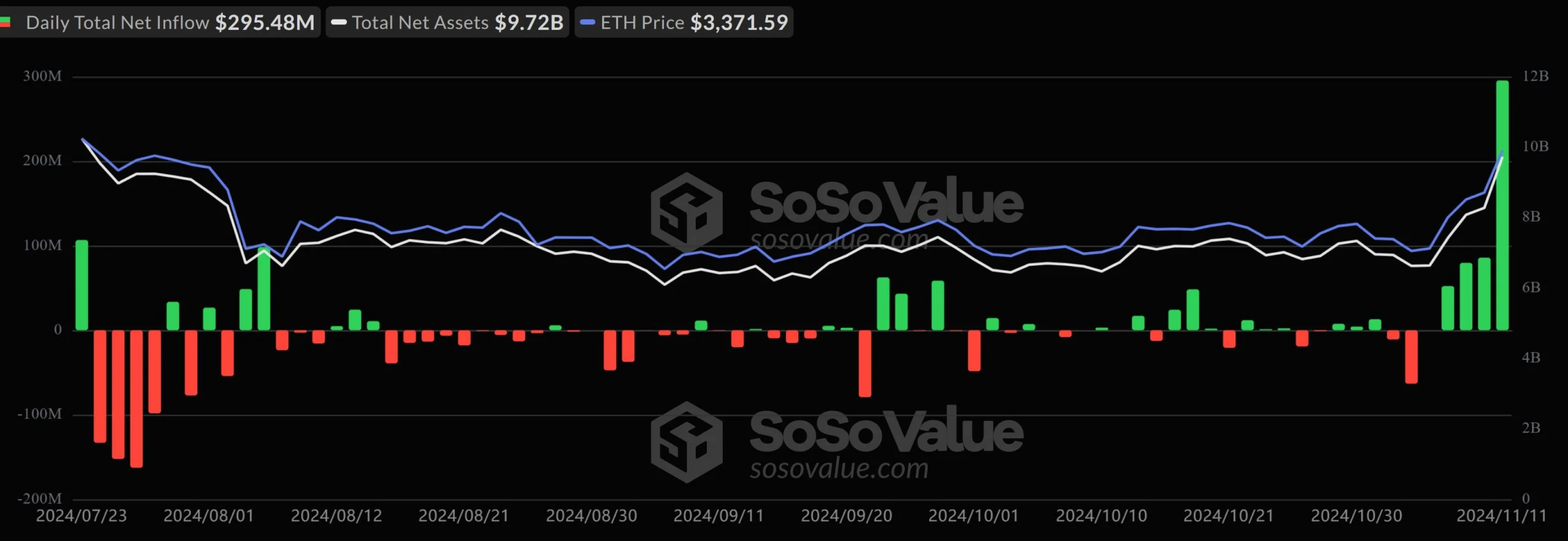 以太坊亮眼的涨幅也吸引到传统金融资金。SoSoValue 数据 显示,以太坊现货 ETF 在 11 月 11 日的总净流入 2.95 亿美元,创下历史上最大单日净流入,打破以太坊现货 ETF 在 7 月 23 日推出当日创下的 1.06 亿美元纪录。
