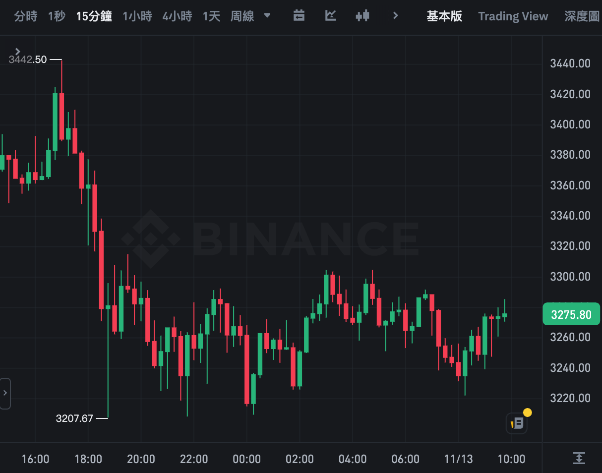 近 12 小时,以太坊持续在 3,200 美元至 3,300 美元之间震盪,截稿前暂报 3,275.8 美元,近 24 小时下跌 1.41%。