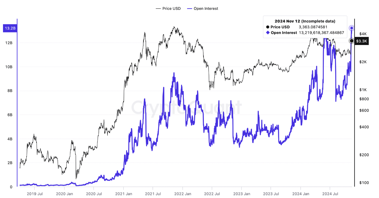 以太坊在过去 7 天的反弹期间,期货市场上的 ETH 部位有所增加。CryptoQuant 数据显示,以太坊在衍生品市场的总未平仓合约(OI)从 11 月 5 日的 980 万枚 ETH 增加到 11 月 11 日的 1320 万枚 ETH,创下历史新高,成长幅度高达 34.69%。