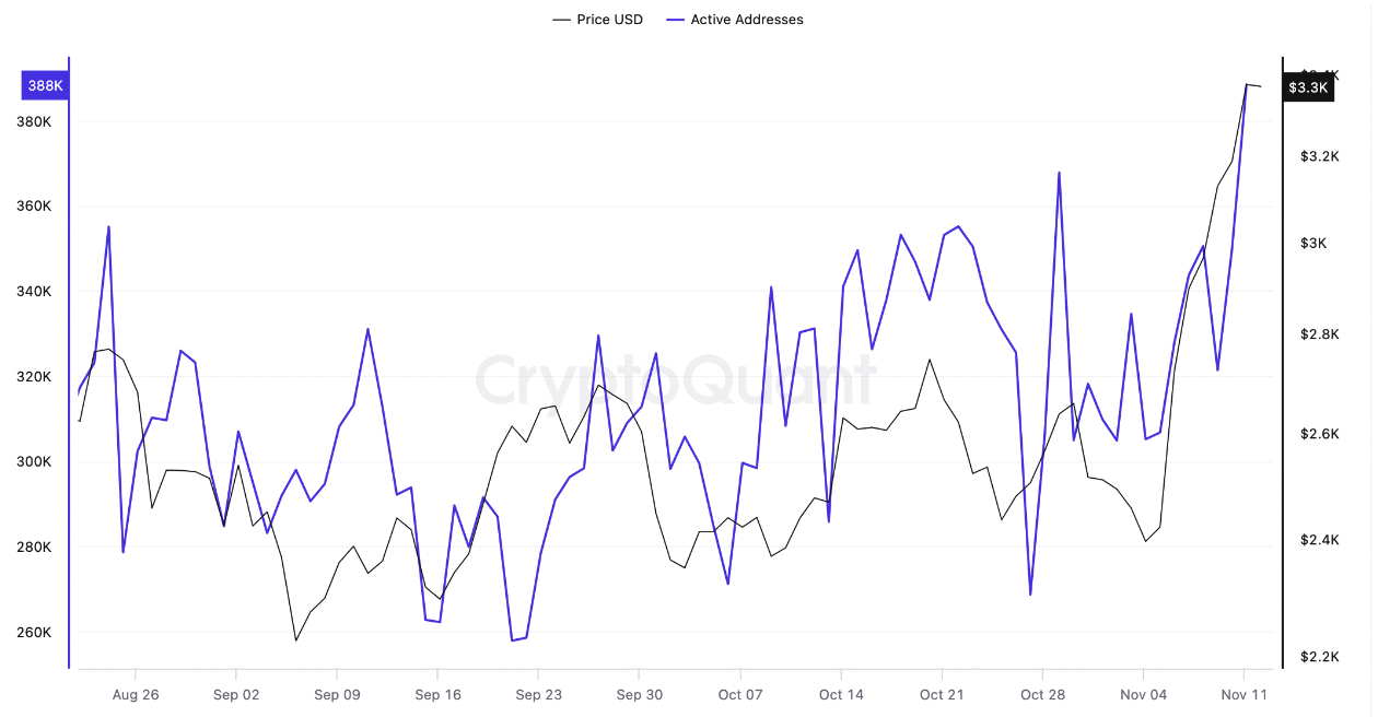 在以太坊的涨幅有目共睹下,以太坊链上的活动也随之增加,其每日活跃地址数(DAA)从 11 月 5 日的 306,751 个增加到 11 月 12 日的 388,350 个,成长了 26.6%。