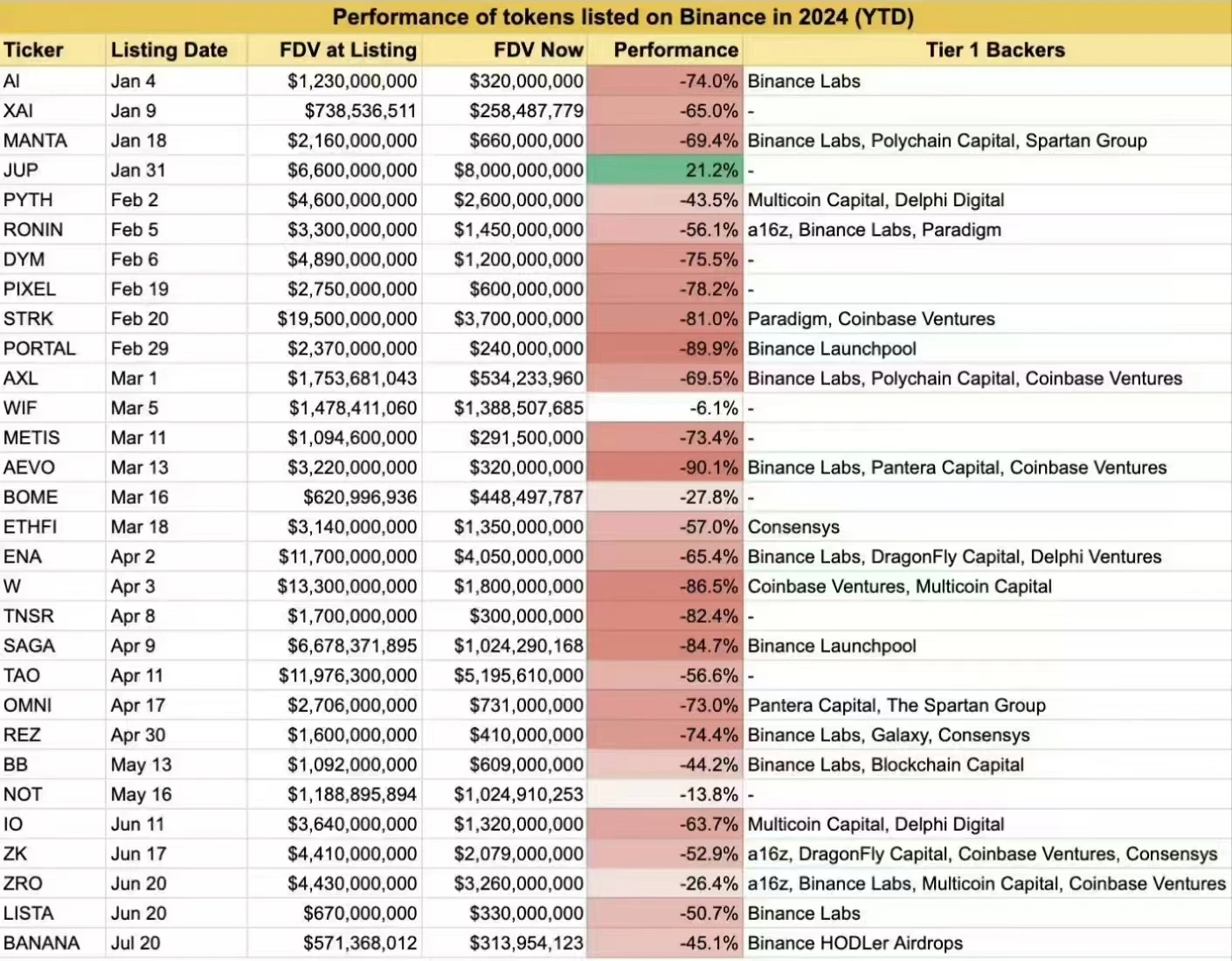 而在这种背景下,作为“加密市场流动性总站”的币安也被推上了舆论风口,有用户曾列出 2024 上半年在币安上线的 VC 币表现,多个代币上线后跌幅超 50% 。因此市场上关于 币安联合 VC 和项目方一起“割社区韭菜”、疯狂吸血用户的声音也越来越大,也让币安在用户心中的形象和信誉受到损失。