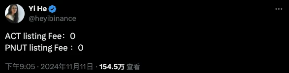 面对质疑,币安联合创始人何一在 X 平台 发文表示 ,ACT 和 PNUT 的上币费均为 0 。 0xWizard 也澄清表示,自己并不知情币安会在当天上线 ACT,这完全是社区的胜利。