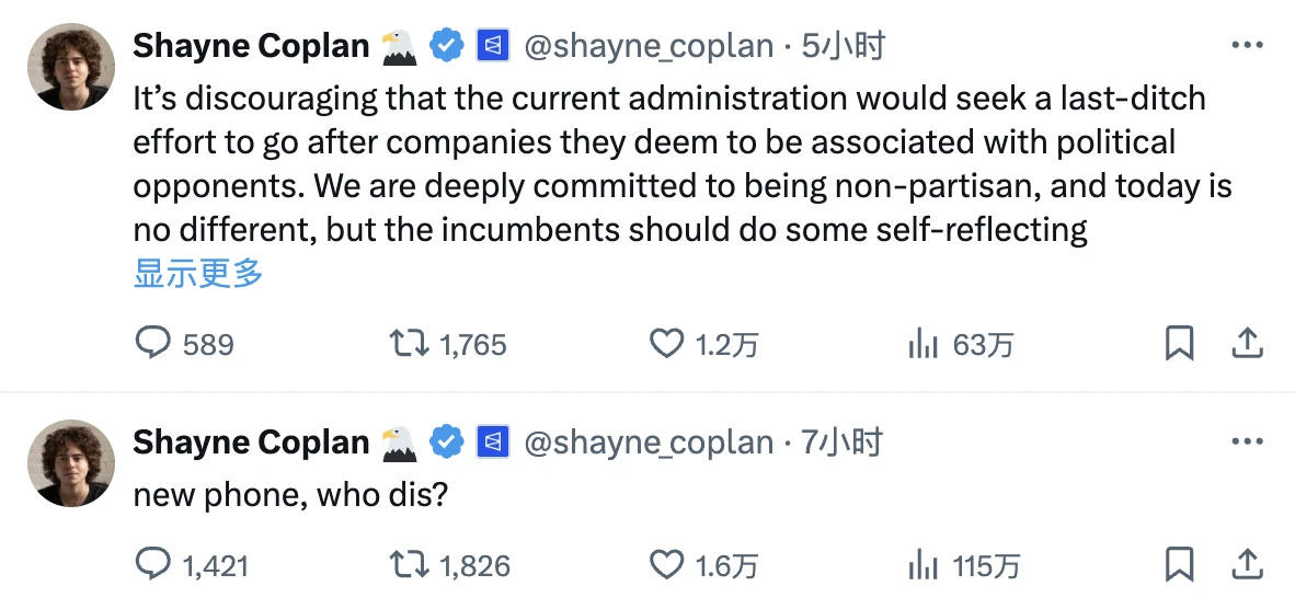 事件发生后,Coplan 本人于 X 相继发布了两则动态,第一则动态是在调侃要换新手机……第二则是正面回应表示:“ 令人沮丧的是,现任政府会采取最后一搏,追捕他们认为与政治对手有关联的公司。 我们坚定地致力于无党派立场,今天也不例外,但现任政府应该进行一些自我反省,认识到采取更有利于企业、更有利于创业的方式可能会改变他们这次选举的命运。Polymarket 在本届选举周期为数千万民众提供了价值,同时没有伤害任何人。我们对此深感自豪。我可以昂首挺胸地说,美国的未来,尤其是美国企业家精神的未来从未如此光明。面对逆境,我们将持续建设。”