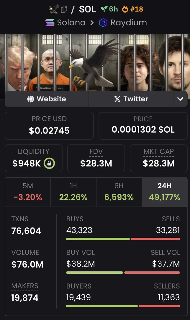 此外 meme 社区也很快对此事作出了反应,以“释放 Coplan”为主题的 meme 代币 FREE Shayne Coplan(代币符号是只“老鹰”)的市值一度冲上 3000 万美元。