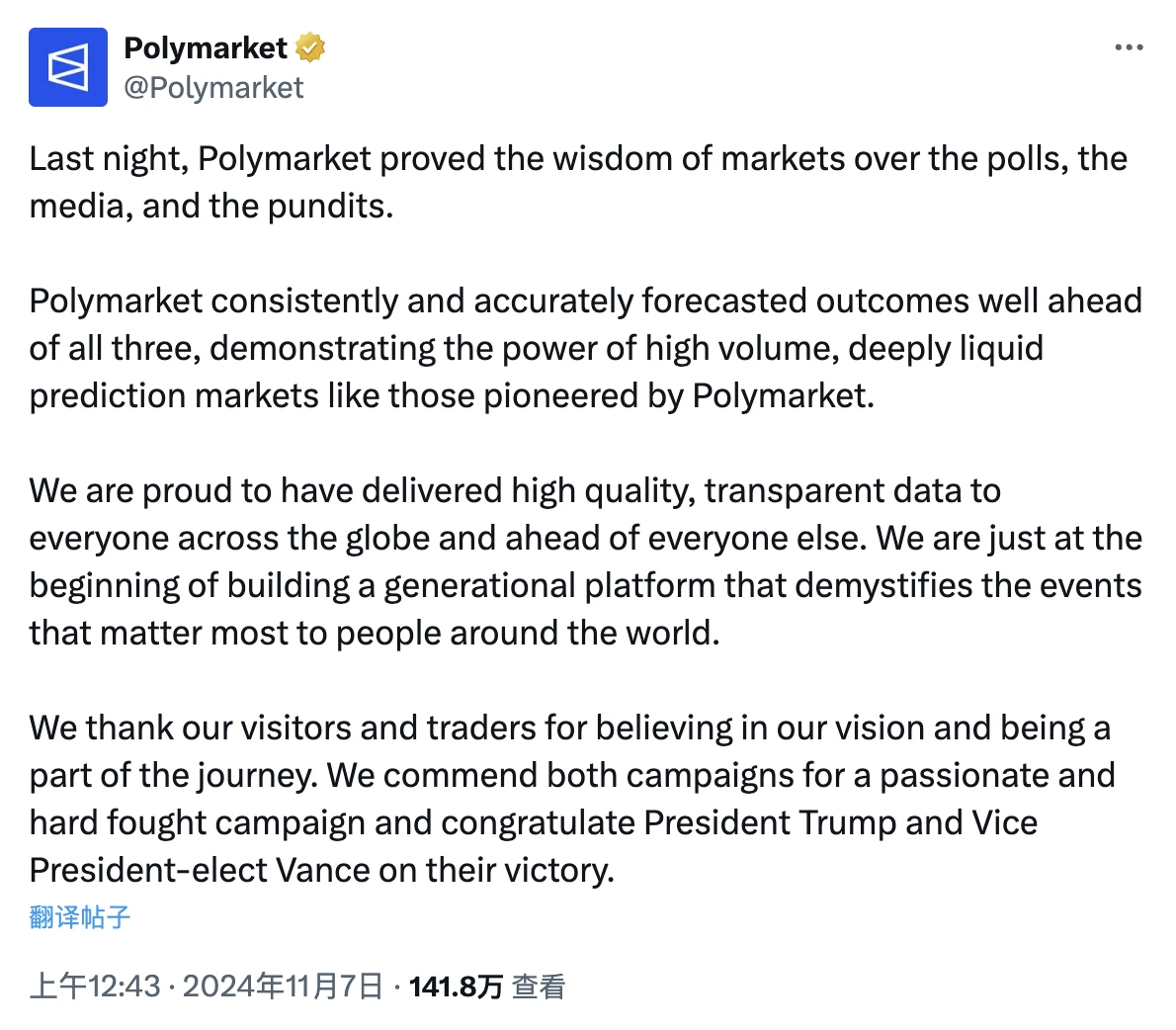 在特朗普最终胜选后,Polymarket 也在官方 X 账户自宣战果:“Polymarket 证明了预测市场比民意调查、媒体和专家更明智,Polymarket 持续准确地预测了结果,远远领先于这三者,展示了像 Polymarket 开创的那些高容量、高流动性预测市场的力量……”