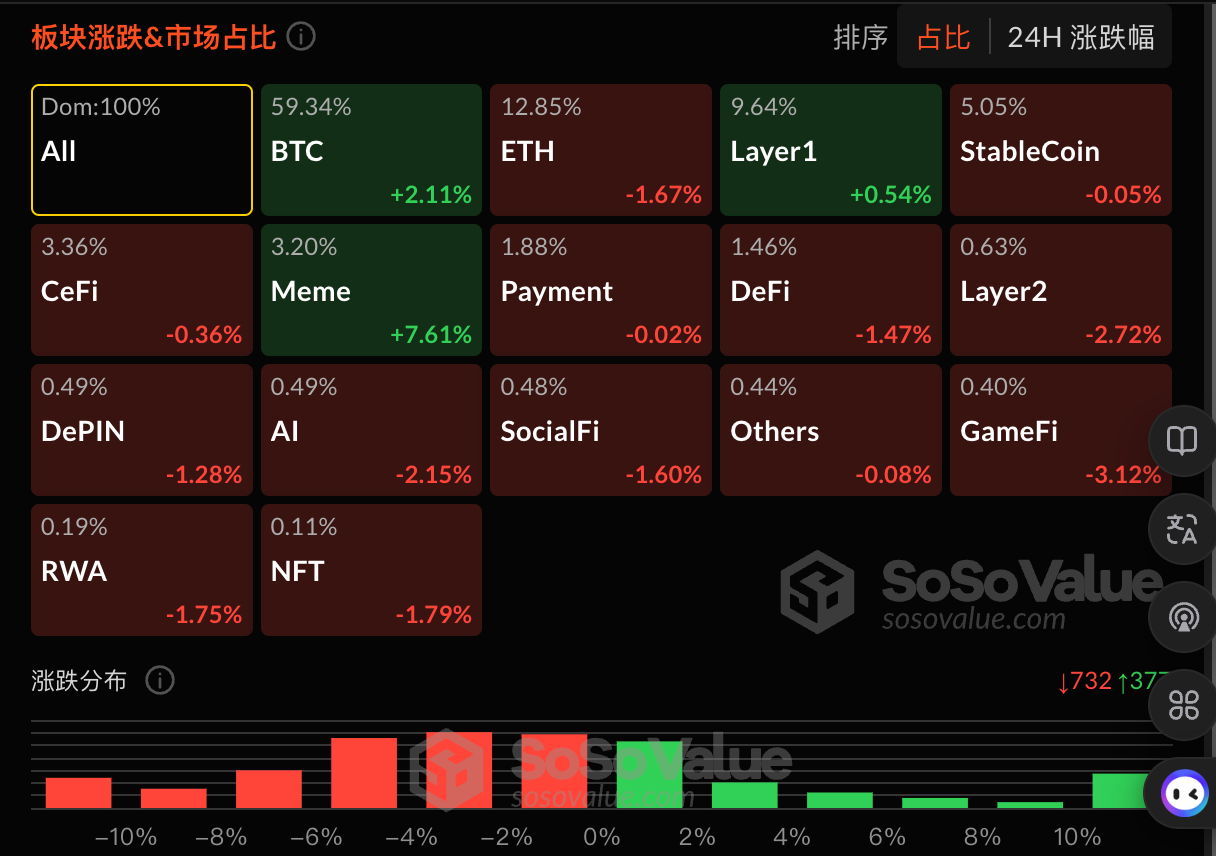 如果你仔细看板块结构,会发现今天的大盘整体略有下降趋势,但 Meme 一骑绝尘。