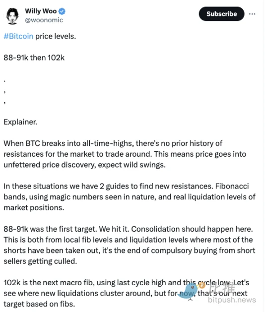 Woo 指出,最近比特币的价格波动与 88, 000 美元至 91, 000 美元区间内的斐波那契水平和清算水平相吻合,这表明当前价格处于一个相对稳定的区间。
