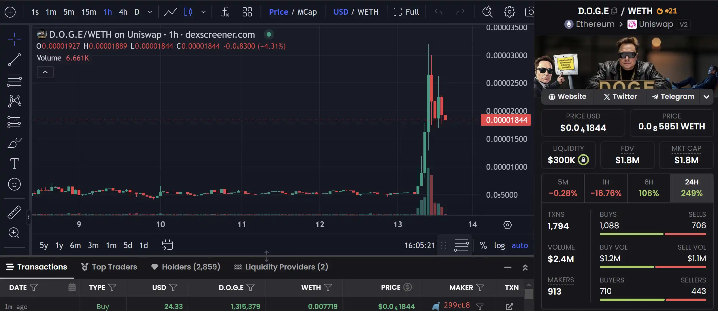 D.O.G.E 是以太坊上和马斯克所任职的 Department of Government Efficiency 同名的 meme 币,在今天川普释出马斯克的任职声明后随之大涨。最高已有 10 倍涨幅,现已逐渐回落。