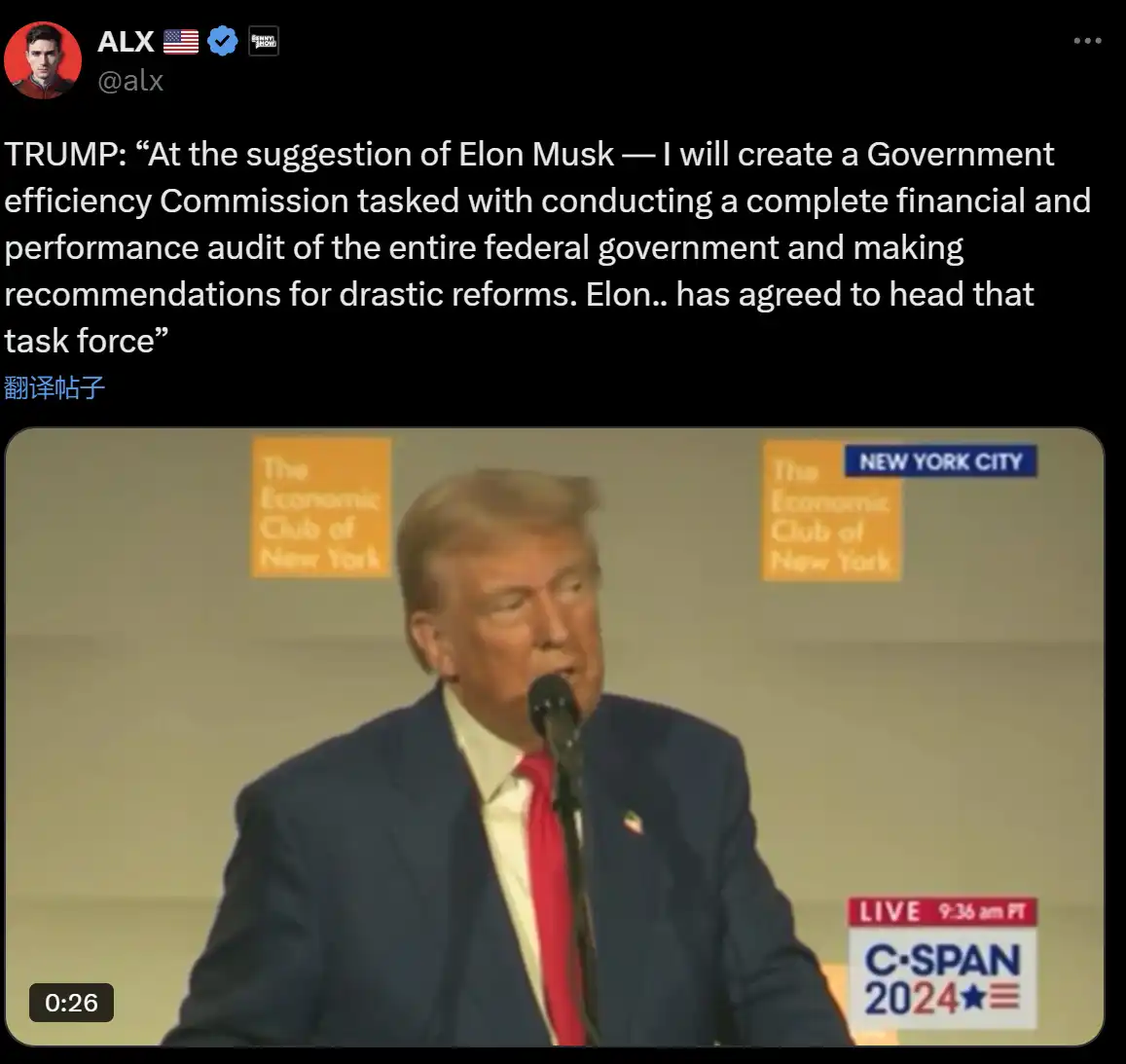 不仅马斯克本人在多处演讲中发表自己关于「政府效率部门」的看法,川普也听从了马斯克的建议。川普曾在 9 月 6 日的一场演讲中表示会在当选后设立「政府效率部门」并由马斯克来领导该部门的工作。