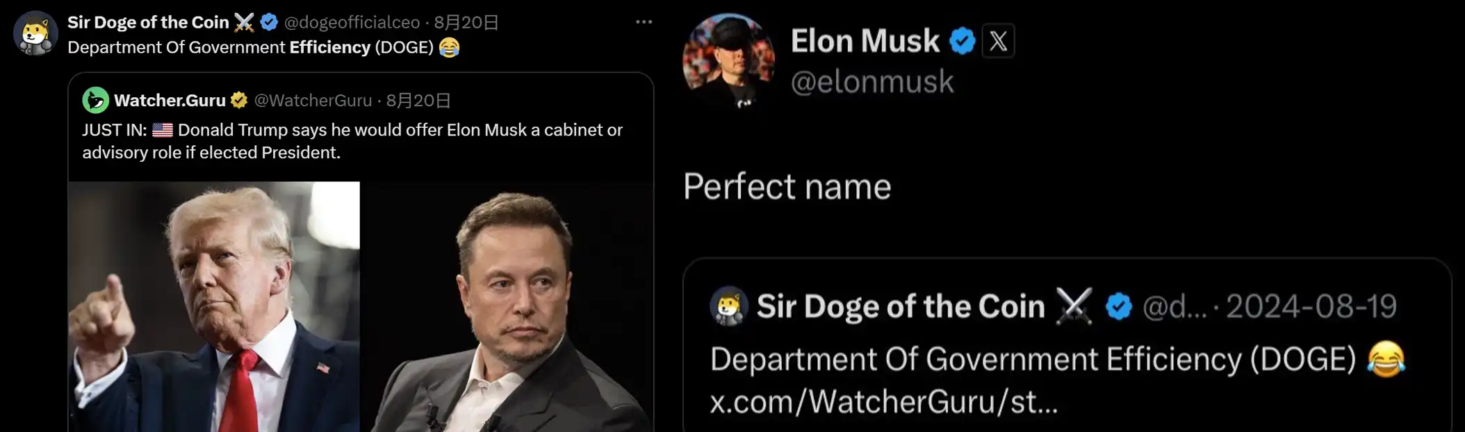 就在外界对于马斯克任职职位议论纷纷的时候,Sir Doge of the Coin 的推特帐号迴应马斯克可以担任 Department Of Government Efficiency(政府效率部门),简称「DOGE」。随后,这则帖子得到了马斯克的关注并转发称「这是一个完美的名字」