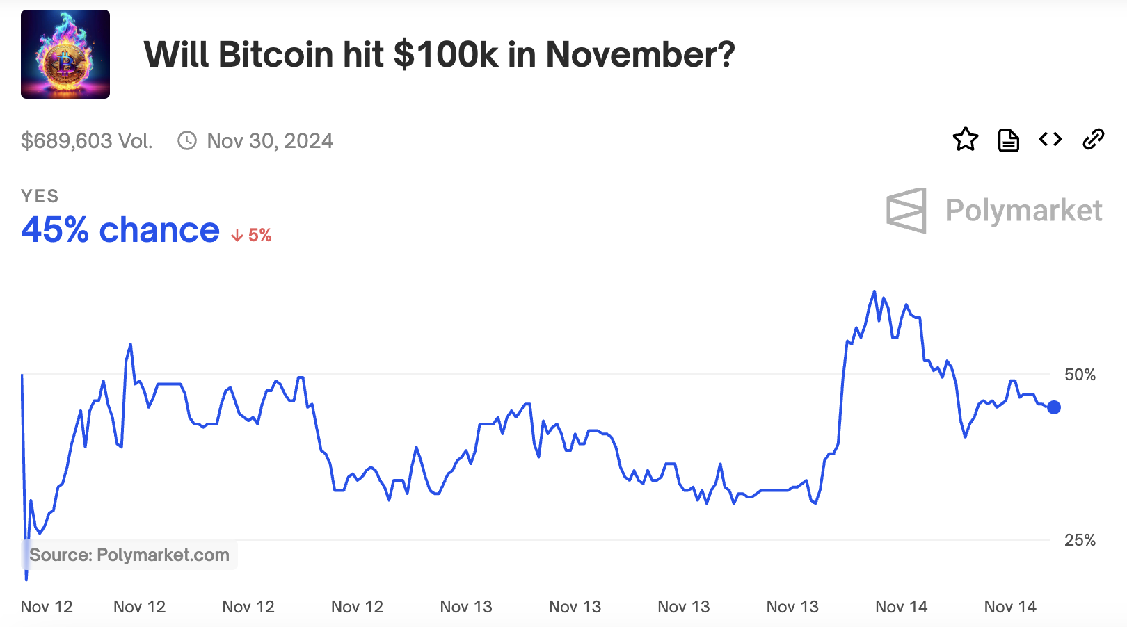 此外, 精準命中川普当选总统 的链上预测市场 Polymarket 数据指出,市场押注比特币在 11 月前触及 10 万美元的机率一度超过 50%,目前已回落至 45%。