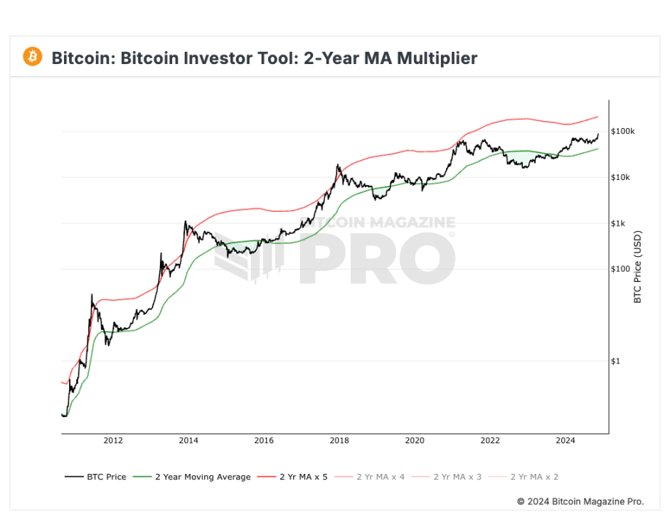 比特币的 2 年 MA 乘数和 200 周移动平均线热力图都是用于分析比特币价格长期趋势的指标。2 年 MA 乘数指的是比特币价格与其 2 年(约 24 个月)简单移动平均(SMA)之间的比率,用于衡量比特币的市场价位是否偏离长期平均水平。它有助于判断比特币价格是否处于相对高估或低估状态。