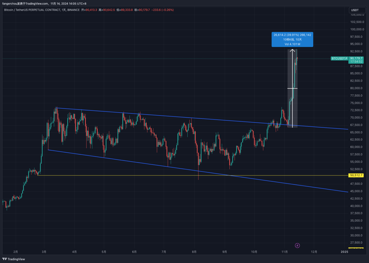 现阶段,比特币的价格突破了长期震荡区间,仅在短短十天内便上涨了约 40% ,从 66800 美元一路攀升至最高点约 93200 美元附近。市场情绪空前高涨,各类投资者纷纷入场,乐观情绪蔓延开来。