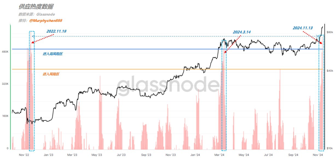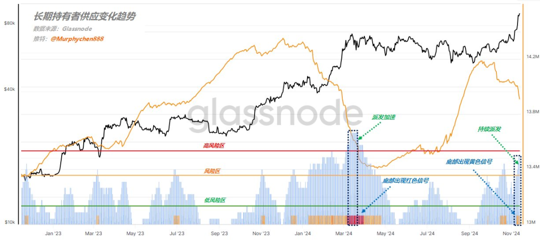尤其是 11 月 13 日,市场供应量的激增突破了今年 3 月的高点,而那时灰度 ETF 的资金派发尚未结束,如今却没有类似的事件作为推动力量。这种供应激增与 2022 年 11 月比特币跌至 16, 000 美元时的市场恐慌期类似,显示出当前市场情绪的巨大反差。长期持有者的行为模式也进一步佐证了市场的卖压,虽然目前尚未出现明显的见顶信号,但 LTH 的持续派发已将市场推向「中风险」区域,接近加速派发的临界点。