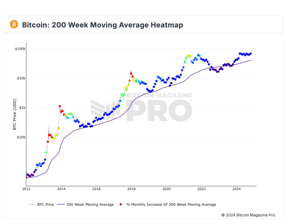 比特币的 200 周移动平均线(200-week moving average, 200 WMA)是一个非常重要的长期趋势指标,通常用来衡量比特币价格的长期健康状况。该指标显示了过去 200 周(约 4 年)的平均价格,反映了市场的长期周期和价格波动。