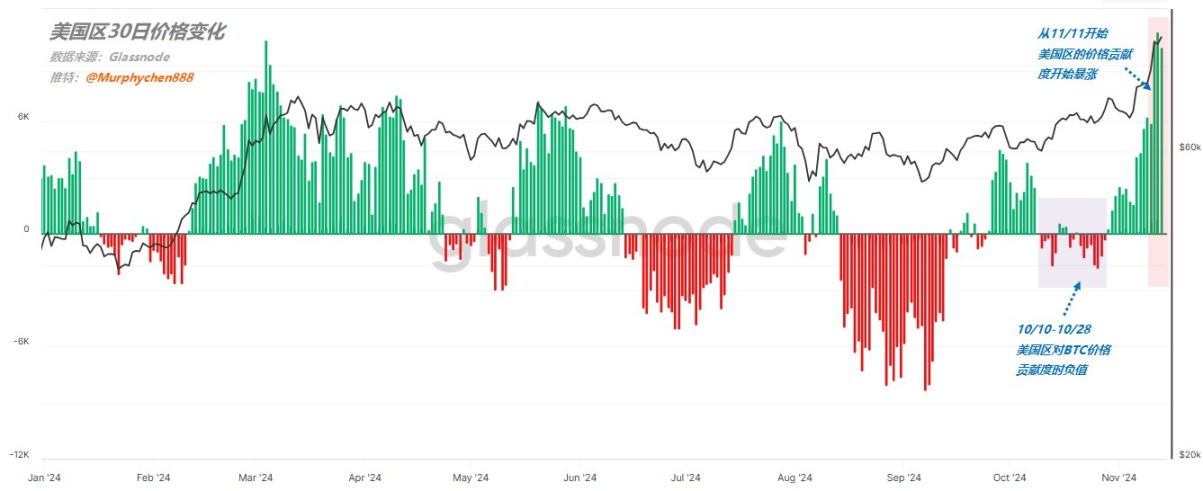 尽管市场的供应压力日益加大,强劲的需求依然支撑着比特币价格的上行。特别是从 11 月 11 日起,美国投资者情绪的高涨成为推动价格上涨的重要因素。数据显示, 10 月到 11 月期间,市场主导力量由亚洲和欧洲转向美国,这一转变使得市场的推动力变得更加明显。伴随着需求的增加,市场的利润创造能力也在快速上升,表明需求不仅是短期现象,而是持续了一段时间的强劲动力。