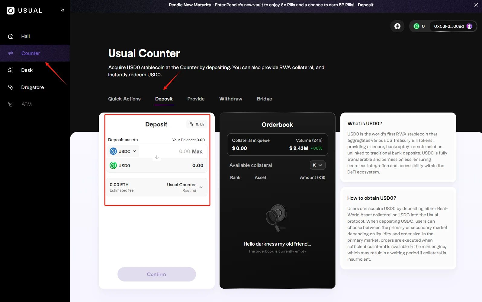 STEP 2. 点击“Counter”后点击“Deopsit”,将 USDC 兑换成 USD0。