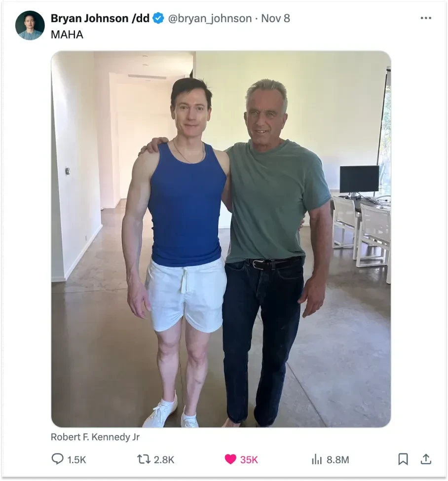 注意这个梗:Make America X Again。Bryan Johnson 发了一张自己与 RFK Jr. 的合照,并配文「MAHA」,即 Make America Healthy Again(让美国再次健康)。