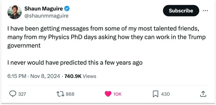 通过让人们相信变革是可能的——即便只是把他们的希望投射到这种变革上——特朗普政府正在让与政府合作变得「酷」起来。Bryan Johnson 就是其中一员,世界上最富有的人、刚刚用筷子接住 22 层楼高火箭的 Elon Musk 也在其中。那些过去从未想过与政府合作的天才们,现在也都在寻找机会参与其中。Sequoia 的 Sean Maguire 透露,他接到了一些物理学博士的询问,问他们如何才能在特朗普政府工作。