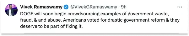 Vivek 在推特上表示,DOGE 将通过众筹的方式收集民众的意见:「美国人投票支持彻底的政府改革,他们应当有机会参与修复政府。」