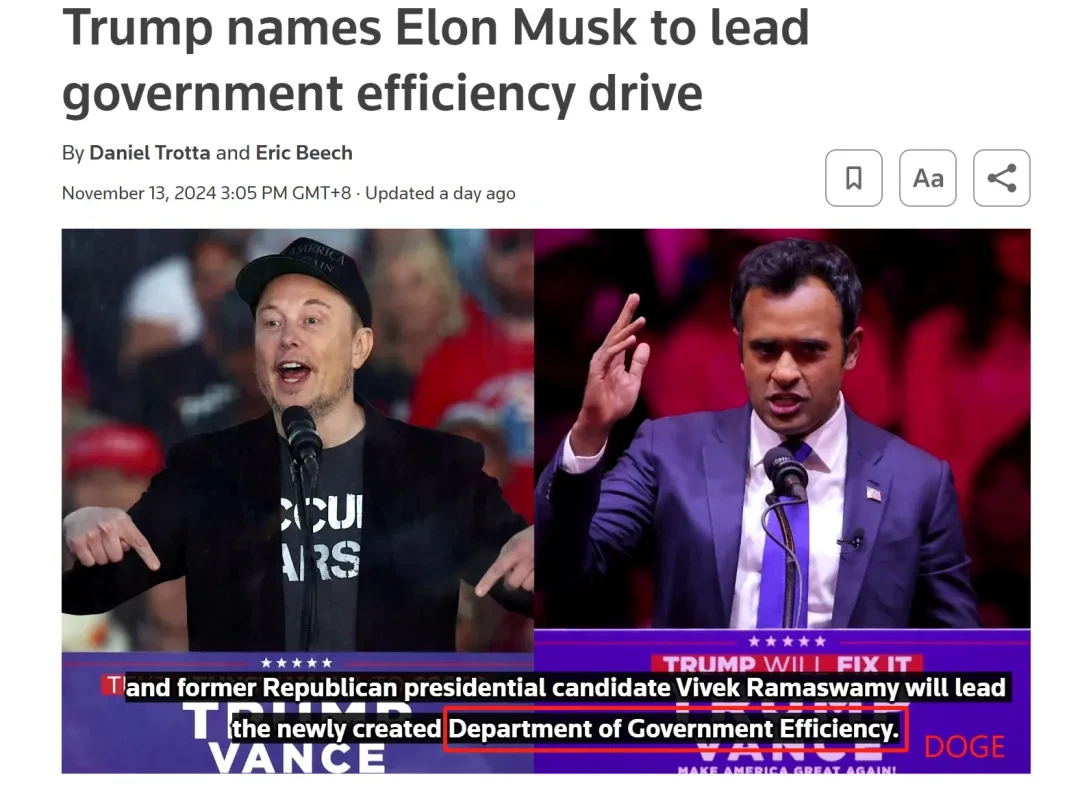 11 月 13 日,特朗普宣布,埃隆·马斯克和维韦克·拉马斯瓦米将共同领导新成立的「政府效率部门」。