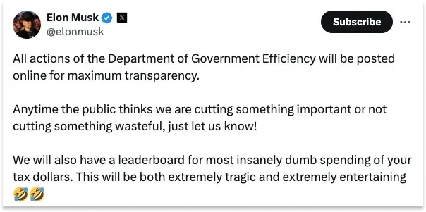 这是一个久违的机会,人们感到自己有可能亲自参与到让美国这台「大机器」更加顺畅运转的过程当中。马斯克也在 X 平台上表示,他们将公开分享 DOGE 的所有行动。