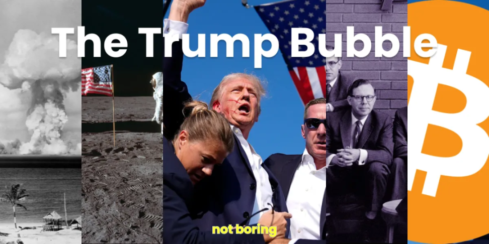 众所周知,当前加密公司面临的最大风险之一是政府监管可能拖慢它们的发展,甚至导致停滞不前。过去一周我密切关注美国政治动向,发现当前的局势与我平时讨论的内容有许多相似之处,且比预期中更令人乐观。我的直觉告诉我,我们正站在所有泡沫的开端——一个泡沫制造机,孕育无数泡沫的泡沫:特朗普泡沫。