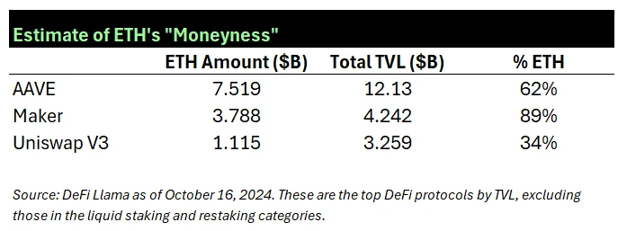 但是,ETH 是否真的受益于「以太坊生态」的主导地位吗?或者说,以太坊及其模块化部分正在蓬勃发展,但并没有将 ETH 本身作为一种资产?事实证明,ETH 是更广泛的以太坊生态中无处不在的一部分。当以太坊扩展到 L2 时,ETH 也是如此。大多数 L2 使用 ETH 支付 gas,而且大多数 L2 TVL 中的 ETH 至少是其他代币的 10 倍。观察下表,就可以了解以太坊生态中三个最大的 DeFi 应用在其主网和 L2 实例中 ETH 资产的主导地位。