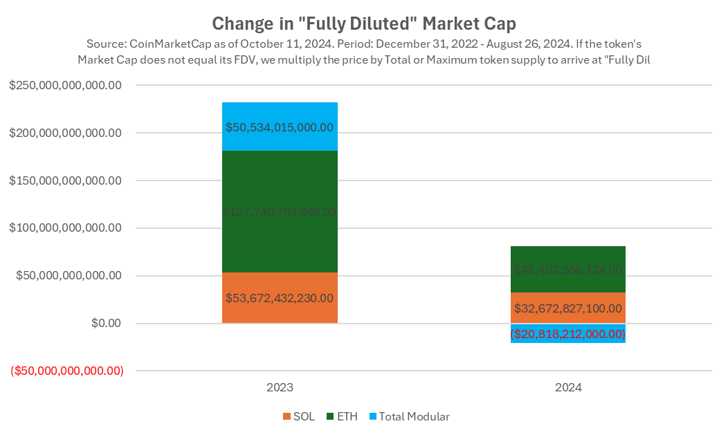 模块化生态发出了强烈的「意见」。2023 年,市场给予与以太坊一致的模块化基础设施代币的增长与给予 Solana 的增长相同,但 2024 年的情况并非如此。
