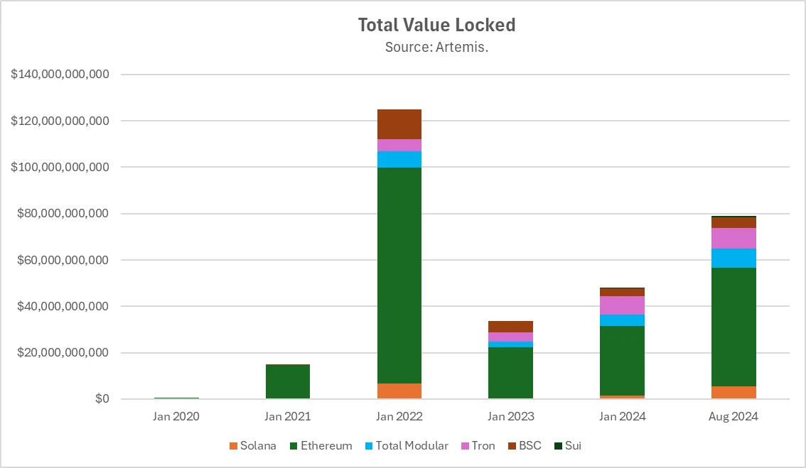 如果从 TVL 市场份额的角度来考虑,当以太坊于 2015 年推出时,它拥有 100% 的市场份额。尽管有数以百计的 L1 竞争者,但以太坊及其模块化生态至今仍保持着约 75% 的市场份额。