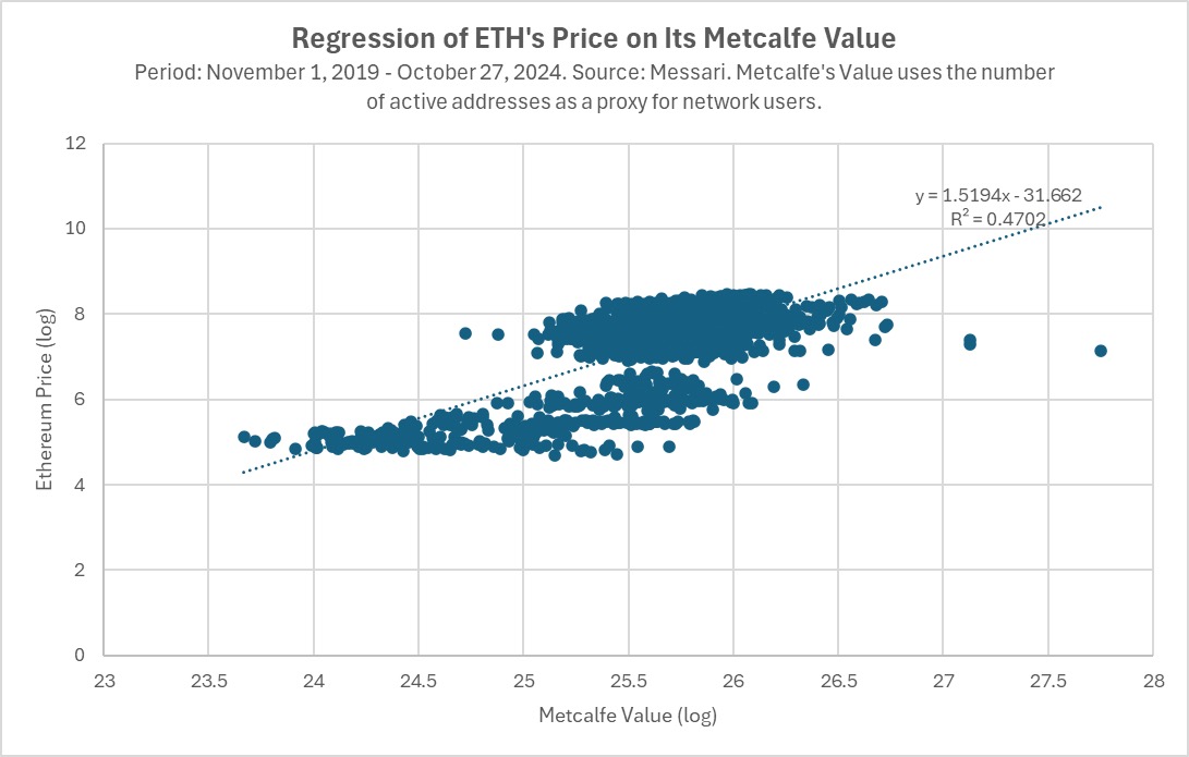在过去三年中,以太坊费用(以 ETH 为单位)与 ETH 价格之间的关系在统计学上非常显著,每周的相关性为 +48%。如果以太坊产生的费用在一周内下降 1000 ETH,那么 ETH 价格平均贬值 17 美元。