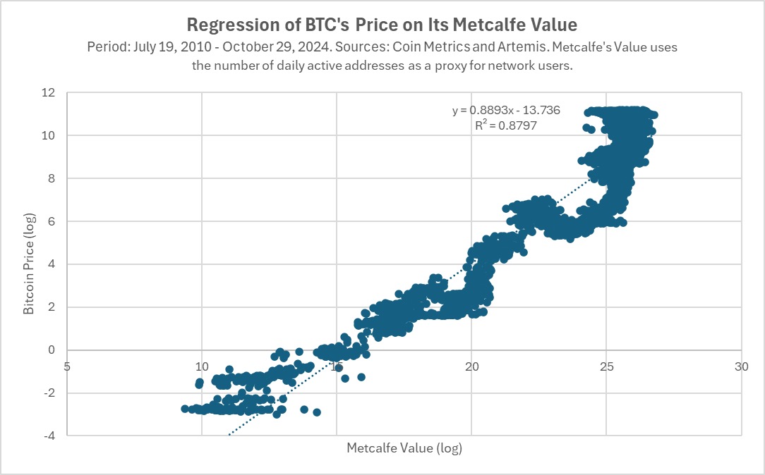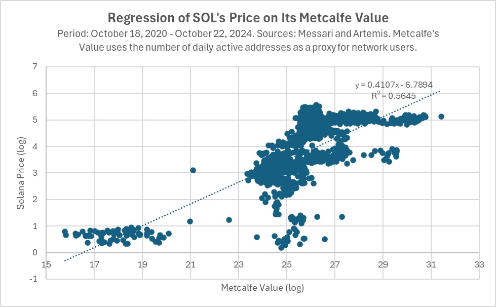 在 Web3 中,协议的价值取决于其平台上的整体活动量,取决于拥有最活跃的构建者和用户生态。下面是我们对比特币、以太坊和 Solana 的代币价格与梅特卡夫值(衡量网络中用户数量的指标)之间关系的分析。在所有情况下,代币价格都与梅特卡夫价值高度相关,这种关系持续了数年,而就比特币而言,这一关系已经持续了十多年。
