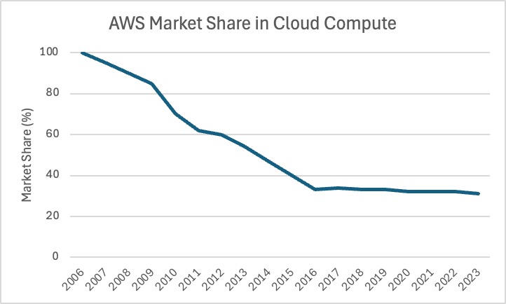 9 年的时间,市场份额从 100% 降到 75%,这已经很不错了!要知道,AWS 在大约同一时期的市场份额从 100% 降至约 35%。