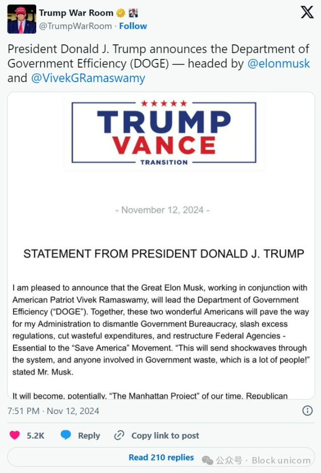 特朗普表示,马斯克与 Meme 相关的创意将存在于政府系统「之外」。这意味着 DOGE 可能不会获得政府资金的支持。这也意味着该项目直接控制美国政府机构预算的能力将非常有限,尽管 DOGE 的指令可能会通过特朗普在国会的支持者得以实施。