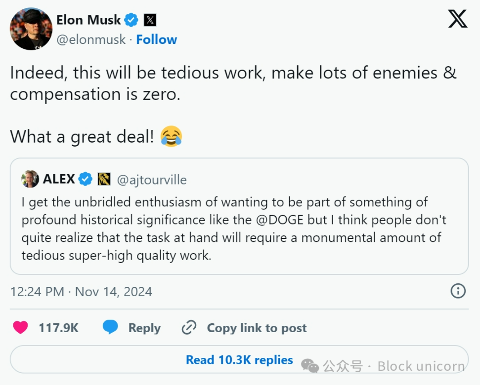 根据该部门周四发布的官方帖子,该计划暂定将由一批「超高智商、支持小政府革命的人士」组成,这些人愿意每周工作 80 小时以上来削减不光彩的成本。埃隆·马斯克本周发推文称,目前尚不清楚将雇用多少员工来为该项目工作,但这些工作将是无薪的。