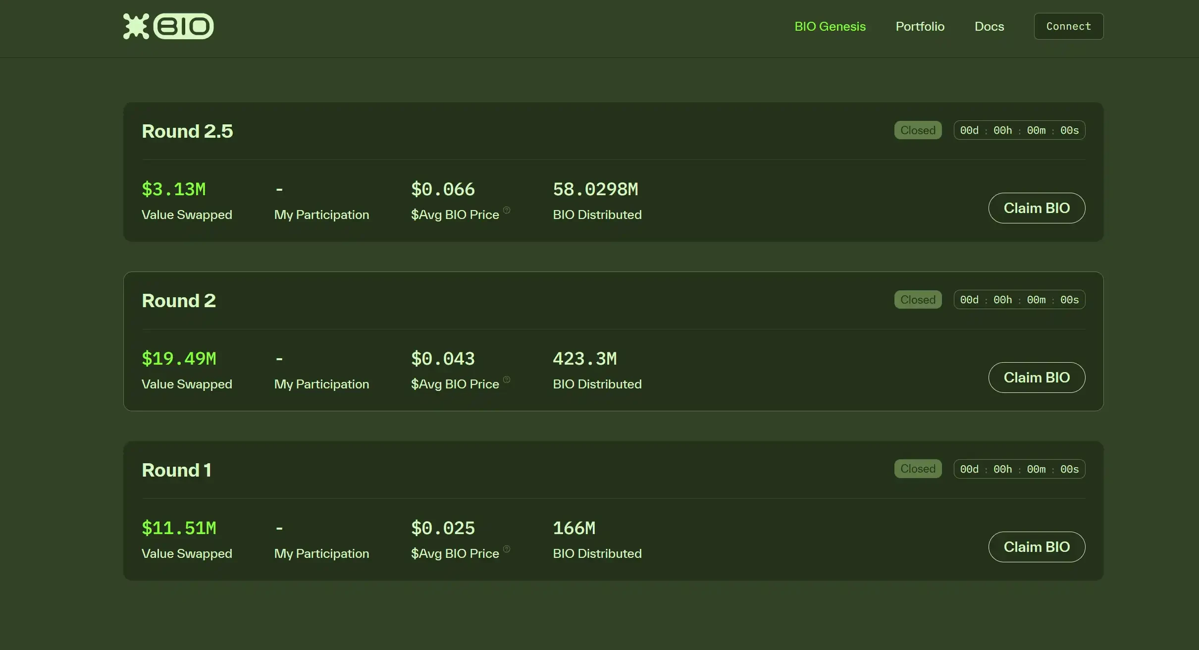 8 月 9 日,BIO Protocol 开启了第一轮 Bio Genesis 代币销售,平均价格为 0.025 美元,交易量达 1151 万美元。第二轮次的代币销售在 9 月 30 日进行,这次 BIO 的平均价格已经有了 72% 的涨幅,为 0.043 美元,交易量也升至 1949 万美元。直到 11 月 10 日的第 2.5 轮次公开拍卖时,BIO 价格升至 0.066 美元,较第一轮涨幅 264% 。目前,BIO Protocol 的拍卖轮次已经结束。