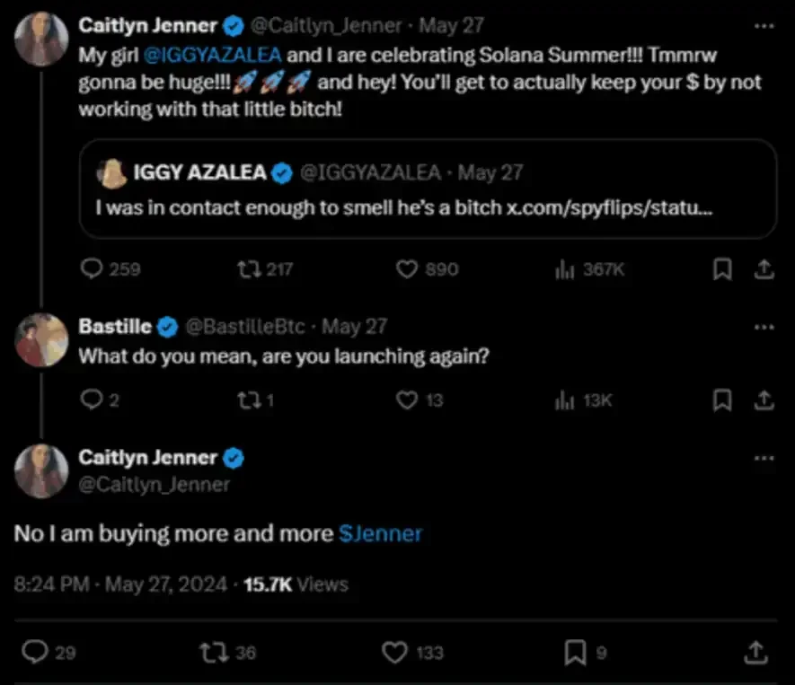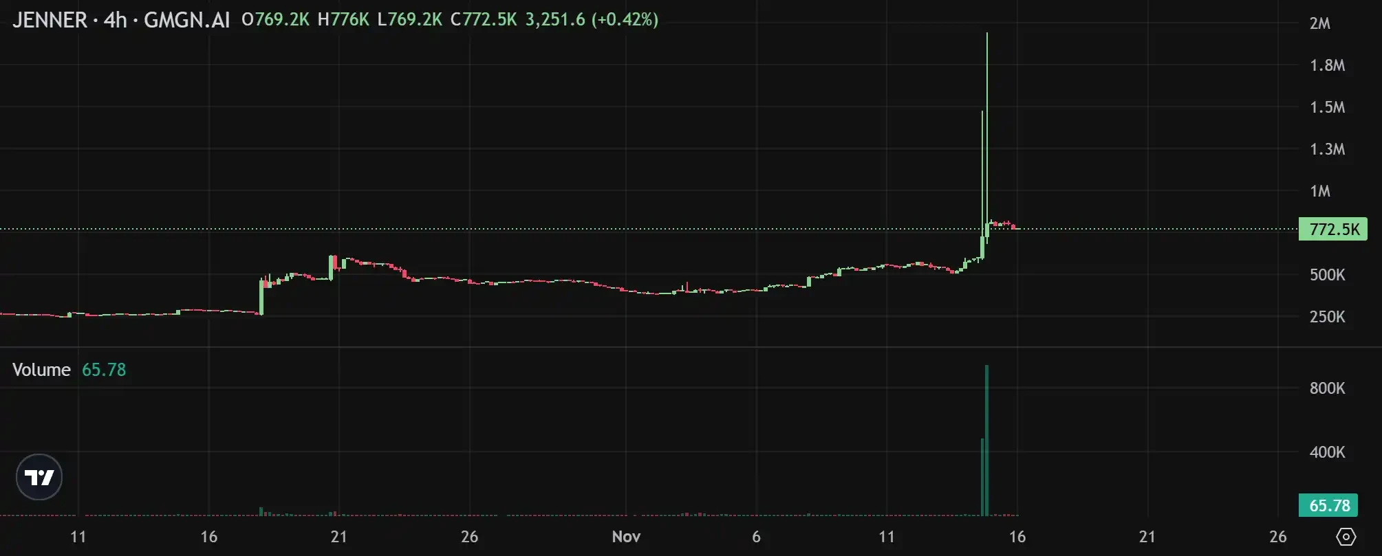 Caitlyn Jenner 是曾经的奥运冠军,但她更为人熟知的身份是金·卡戴珊等卡戴珊家族成员的继父,以及跨性别女性。她的代币 JENNER 于 5 月 27 日在 Solana 上通过 pump.fun 推出,刚推出就因为是否为其本人推出的真实性争议引发了巨大的价格波动。在一系列戏剧性的故事结束后,根据 dexscreener 的数据,市值最高峰时曾达到 4000 万美元。