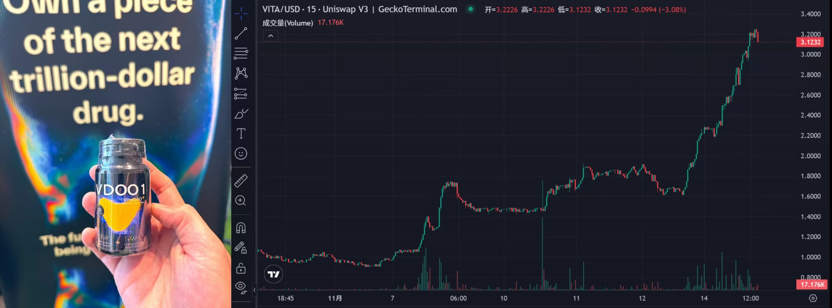 VitaDAO 是一专注于资助早期的长寿研究的团体,筹款金额超 500 万美元,收到过辉瑞风投的投资。自 Vitalik 在曼谷向 CZ 展示 VitaDAO 研制的第一款产品 VD001 后,VITA 就开启了暴拉模式,日内最高涨幅达到 82.4%,最新价格为 3.12 美元,市值超 8000 万美元,近一周涨幅近三倍。