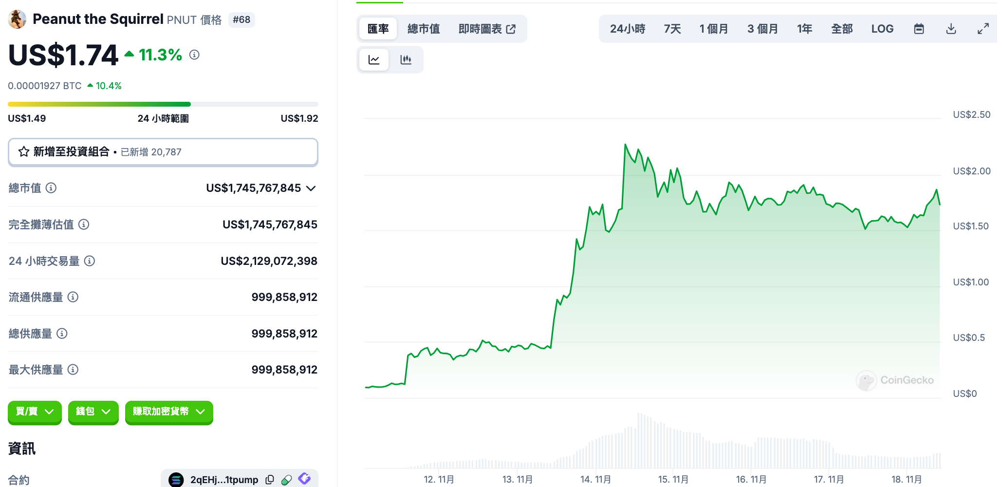 截稿前市值仍有 17.45 亿美元,币价现报 1.74 美元,近 24 小时上涨 11.3%。