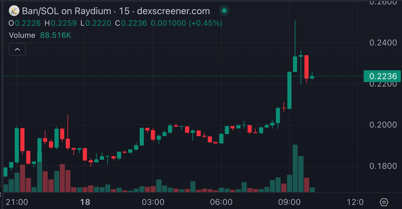 Dexscreener 数据 显示,$BAN 自马斯克转发后的一小时内,从约 0.2 美元暴涨至 0.2508 美元,涨幅高达 25.4%,逼近 14 日创下的 0.292 美元历史高点。截稿前暂报 0.2236 美元,近 24 小时飙涨超 40%,市值达 2.18 亿美元。