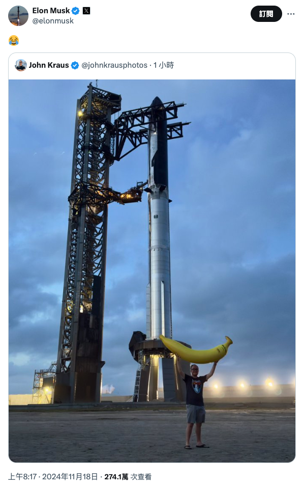 而就在今日早上,「狗狗币教父」马斯克更在 X 上转发了 Polaris(由 SpaceX 支持的私人太空探索计划)内容总监 John Kraus 手举巨大香蕉站在 SpaceX 星舰前的照片,这迅速激起币圈人的快速反应,眾多评论纷纷标记 $BANANA 和 $BAN,两枚代币随即迎来价格上涨。