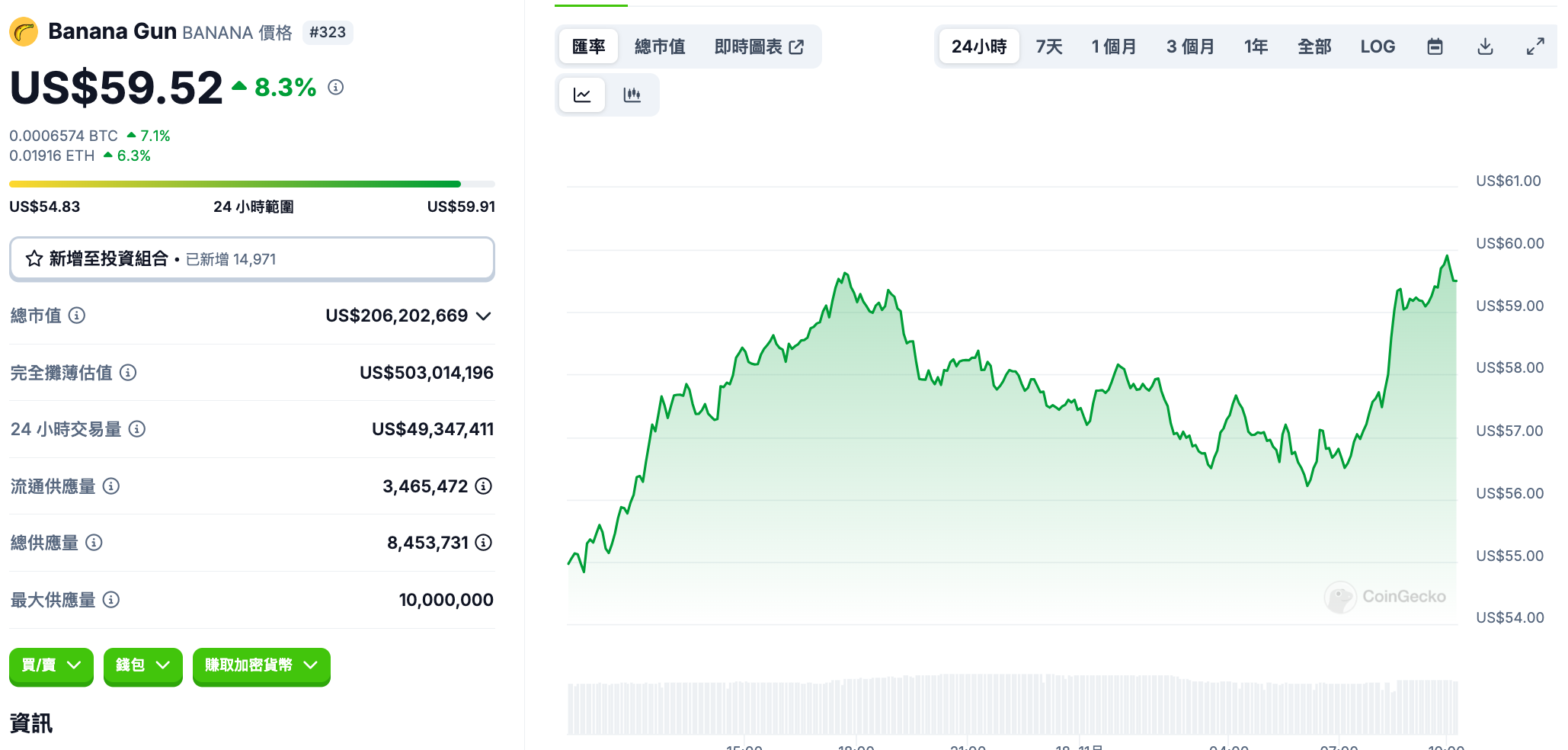 此外,与香蕉同名的代币 $BANANA 也或受此影响上涨。该代币是狙击机器人 Banana Gun 的原生代币,自马斯克转发后价格迅速攀升,截稿前报 59.52 美元,24 小时内上涨 8.3%。