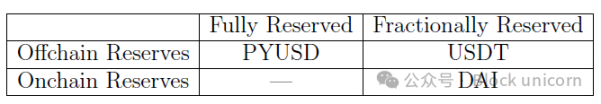 Sebastien 根据稳定币的储备性质(如 RWA 的链下资产与链上加密资产)以及模型是完全储备还是部分储备,使用二维矩阵对稳定币进行分类。